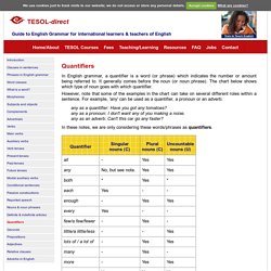 Quantifiers tell us the number of each noun english quantifiers. Articles, ordinals, numbers, demonstratives, possessives, quantifiers.